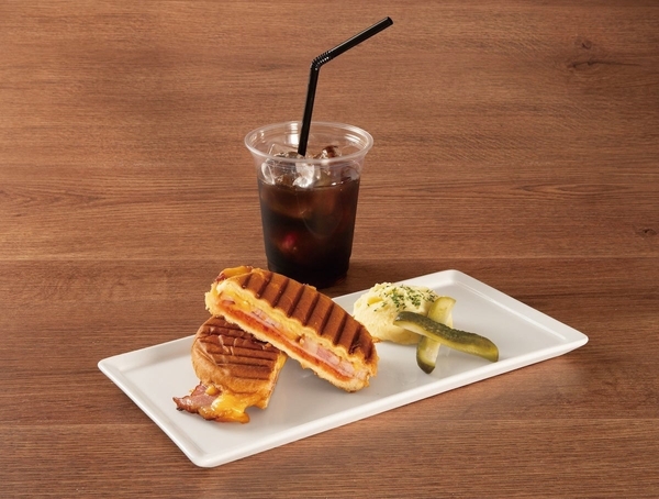 デンマーク産ポークを桜チップでスモークした、厚切りの吊るしベーコンとチェダーチーズ、ハムをサンド。丸いハンバーガー用のバンズをホットサンドにすることで、ほのかな甘みのあるバンズのさっくりとした食感がアクセントになっています。マッシュポテトとピクルスを添えて。