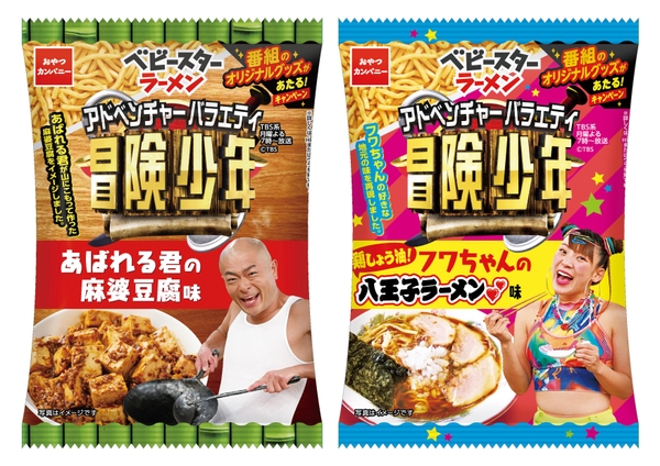 TBSで毎週月曜よる7時から放送中のアドベンチャーバラエティ『アイ・アム・冒険少年』が株式会社おやつカンパニーの大人気商品「ベビースターラーメン」とコラボし、あばれる君とフワちゃんがそれぞれプロデュースしたベビースターラーメンを期間限定で販売中!あばれる君の麻婆豆腐味」は、あばれる君が当番組の山ごもり企画で中国人の女性と一緒に作った「麻婆豆腐」をイメージ。豚肉の旨みとピリ辛風味の絶妙なハーモニーをパリポリ食感のベビースターでお楽しみいただける。