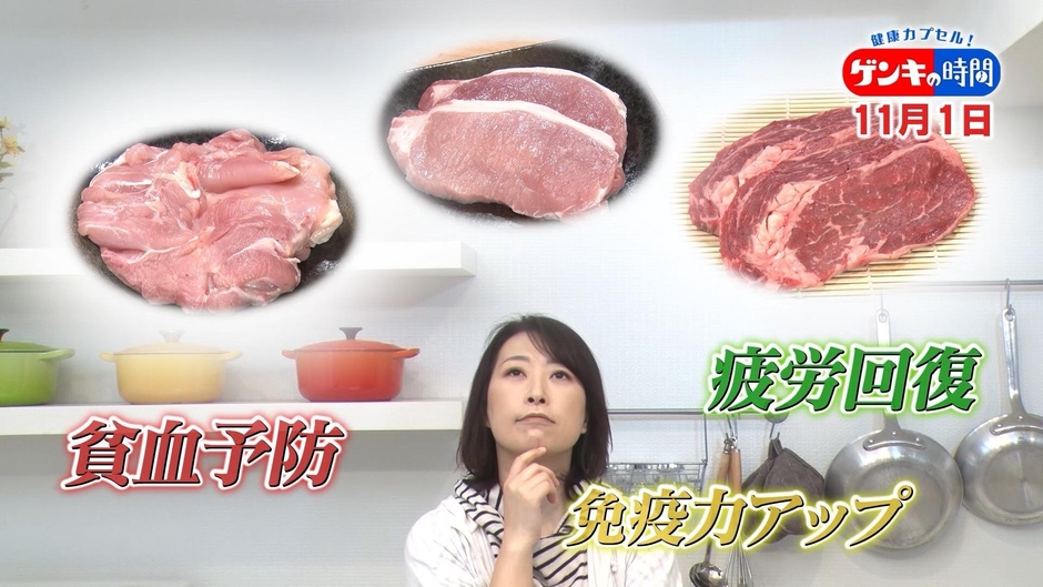 疲労回復、貧血予防、免疫力アップ…あなたが今選ぶべきお肉をご紹介!健康効果倍増の食べ合わせとは?さらに美味しく健康的に焼く「新常識の焼き方」も!11月1日(日)あさ7:00放送『健康カプセル!ゲンキの時間』