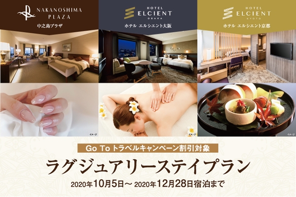 株式会社関電アメニックスが運営するアメニックスホテルズ(ホテル エルシエント大阪・ホテル エルシエント京都・中之島プラザ)では、友人やご家族とちょっと贅沢なひとときをお過ごしいただける「ラグジュアリーステイプラン」を販売しています。ゆったりおくつろぎいただけるよう、各ホテル一番の広々としたお部屋をご用意。お部屋でアロママッサージが受けられるプランや、老舗料亭の会席料理が楽しめるプランなど、ちょっと贅沢なご褒美旅はいかがでしょうか。Go Toトラベル割引きでお得にご宿泊いただけるこの機会にぜひご利用ください。