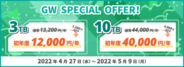 ※2年目以降は通常料金(3TB 年額 13,200 円 または 10TB年額 44,000 円)への自動継続となります。