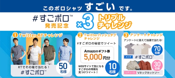 青山商事株式会社(本社:広島県福山市/代表取締役社長:青山理(おさむ))は、ビジネス向けのポロシャツ「ビズポロ」の販売を強化しており、今夏のビズポロ商品は「すごポロ」の打ち出しネームで訴求しています。今回これに連動したSNS施策として、Twitterキャンペーンを5月21日(金)から実施します。