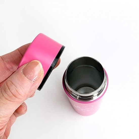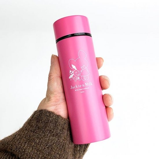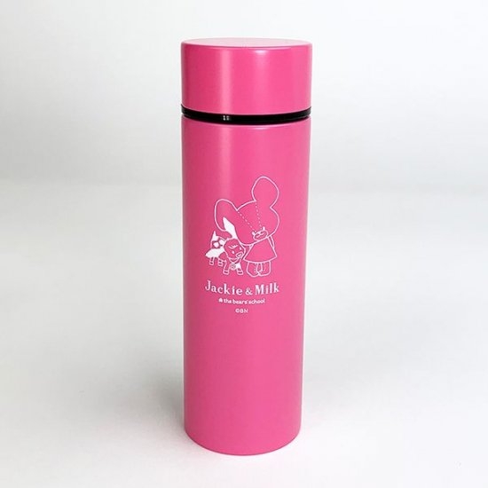 ショッキングピンクガキュートな、くまのがっこうのポケトルです。ステンレス製のボトルで、ランチや外出時の水分補給用に重宝するサイズ。