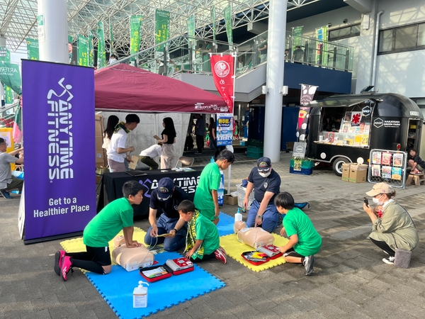 24時間年中無休・マシン特化型のフィットネスジム「ANYTIME FITNESS(エニタイムフィットネス)」は2023年7月9日(日)、紀三井寺公園陸上競技場で開催された、関西サッカーリーグ1部で現在首位の「アルテリーヴォ和歌山」の試合「海南ライフグッズマッチ(6.2 海南水害チャリティー試合)」に南海電気鉄道株式会社と共同でブース出展しました。ブースでは、和歌山市消防局指導のもと、自動体外式除細動器(以下略称:AED)の正しい使い方を指導する「AED講習会」を実施し、ご来場の方、総勢75名にご参加いただきました。