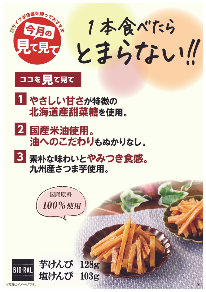 国産原料を100%使用した「BIO-RAL 芋けんぴ/BIO-RAL 塩けんぴ」は、ライフ301店舗の菓子売り場もしくはビオラルコーナーで販売しております。