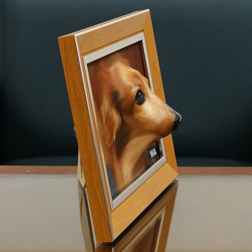 『Poppet(R)』はデジタルカメラやスマートフォンで撮影した高画質の平面写真データを元に作り出すオーダーメイドの『飛び出すペットフォトレリーフ』です。当社だけの特殊技術(特許出願中)により、愛犬や愛猫がいなくても、真正面の写真データを1枚いただくだけで、実際に顔の部分が飛び出した立体のレリーフをお作りします。