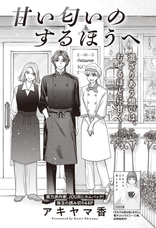 『片恋グルメ日記』や『いま「余生」って言いました?』など、巧みな心理描写で人気を集める実力派作家・アキヤマ香先生がJOURに帰還! 穏やかで甘い魅力を放つ男性パティシエと、彼の妻、そして見習いとして入ってきた若い女性のほろ苦い三角関係を描きます。