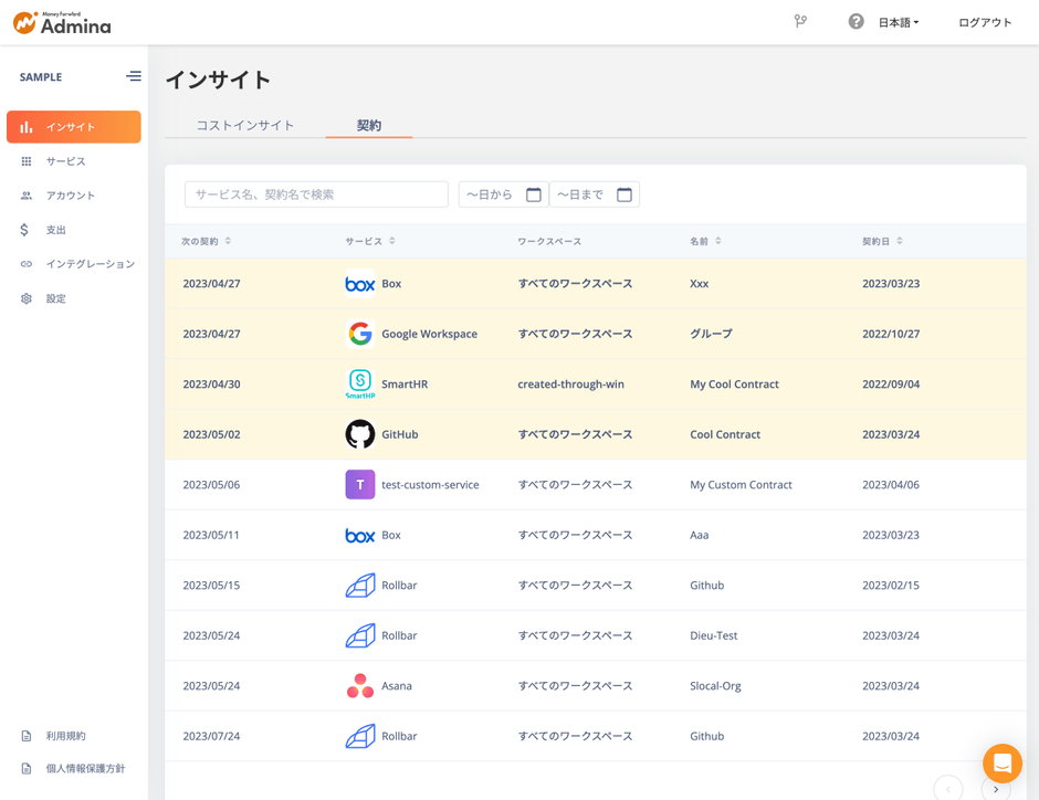 2.登録したSaaSはインサイト > 契約タブから契約更新日の近い順に並べ確認可能