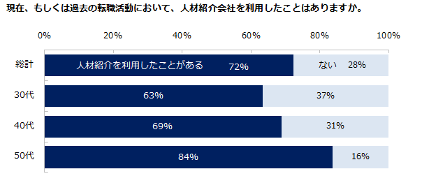 ミドル(35歳~49歳)の方を対象に「人材紹介会社」を利用した転職をしたことがあるか伺ったところ、全体では72%の方が「ある」と回答しました。年代別で見ると、50代の84%が「利用したことがある」と回答しており、年代があがるにつれ人材紹介会社を利用したことがある方の割合が高くなっています。