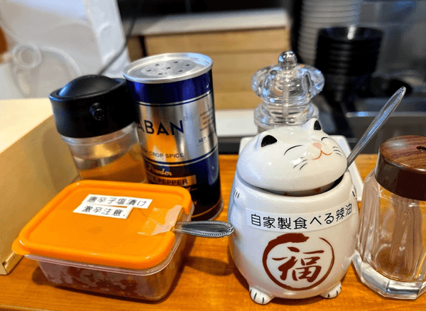 テーブルには味変用の自家製辛味調味料も置いてあり、こちらも人気があります。