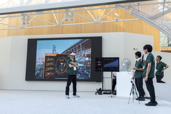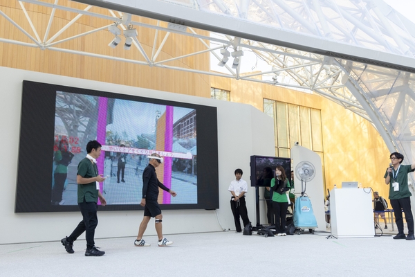 来場者はふくらはぎにセンサーを装着し、歩くだけで自分の歩行能力が数値化され、AIアバターとともに運動できる“未来のFitnessジム”を体感しました。シンプルな操作で結果が得られる手軽さと、最先端技術によるフィードバックは多世代から高く評価されました。本学大学院生が進行を担当し、歩行年齢の測定からAIアバターとの運動まで盛り上げてくれました。