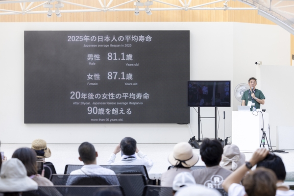 工藤所長がWalkCareの開発背景や研究成果を解説し、来場者の前で実際に歩行年齢の測定とAIによる運動解析を実演しました。装置を使った測定の様子やAIによる運動アドバイスの画面が披露され、歩行能力と健康寿命との関係について理解を深めていただく場となりました。
