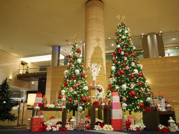 神戸ポートピアホテルのツリー&イルミネーション 幸せを運ぶ妖精はどこにいる?! 赤×白を基調とした北欧風のクリスマスデコレーション