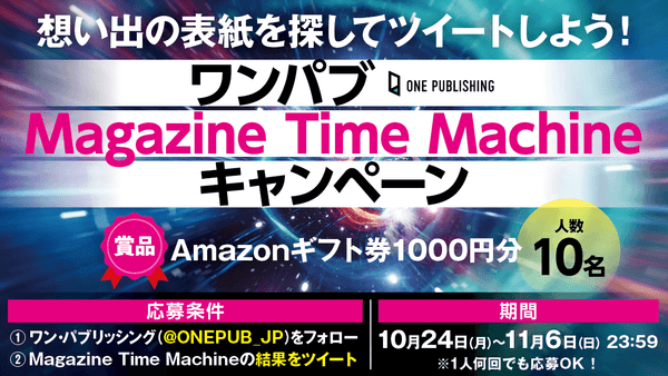 この度、「Magazine Time Machine」の公開を記念して、2022年10月24日(月)~11月6日(日)23:59の期間で、Twitterキャンペーンを実施いたします。応募方法は、ワン・パブリッシングの公式Twitterアカウント(@ONEPUB_JP)をフォローして、タイムマシンの結果をツイートするだけ。