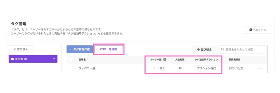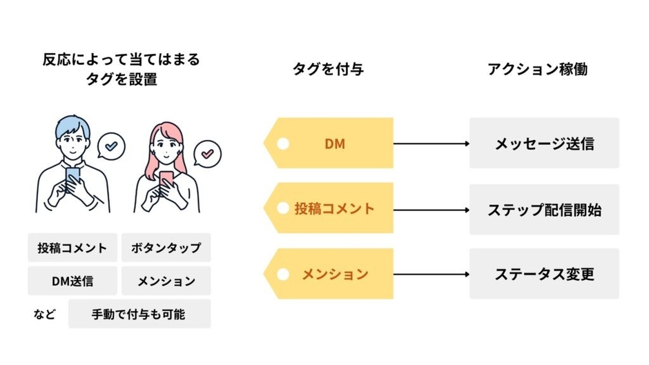 また「タグ追加時アクション設定」により、タグが付与された時点で自動的にテンプレートメッセージを送信するなど、タグごとに自動アクションを設定することも可能です。