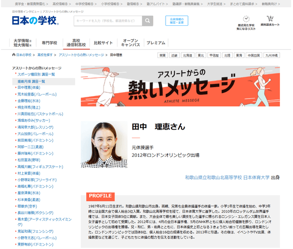全国の大学・短大・専門学校などの学校情報を提供する、株式会社JSコーポレーション(本社:大阪市北区 代表取締役社長:米田英一)は、アスリートからの熱いメッセージ「体操/田中理恵さん(https://school.js88.com/scl_h/onepoint-advice/sport?item=15&athlete=237 )」を公開しました。