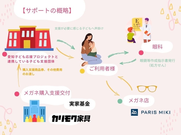 愛知子ども応援プロジェクトと連携している子ども支援団体が「見えにくさ」を感じている子どもたちへ声掛けを実施し、ニーズを確認します。眼科医にて処方せんを取得後、近隣のパリミキでメガネを購入。メガネの購入代金(商品券)はカリモクグループ、パリミキ、実家基金から支援されます。