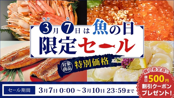 また、3月7日の「さかなの日」にちなみ、3月7日から3月10日の4日間に限り、対象商品をご購入者いただいた方全員に、後日使える500円分のクーポンをプレゼントします。