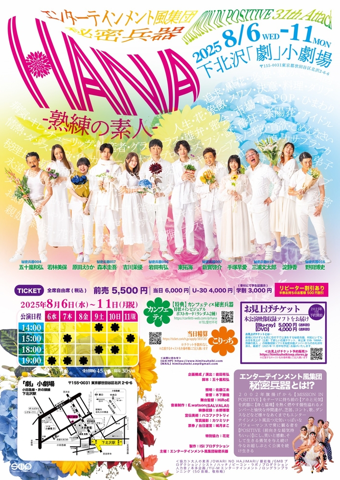 エンターテインメント風集団 秘密兵器 MISSION IN POSITIVE 31th Attack『HANA -熟練の素人-』が2025年8月6日(水)〜11日(月)に「劇」小劇場(東京都世田谷区北沢2-6-6)にて上演されます。