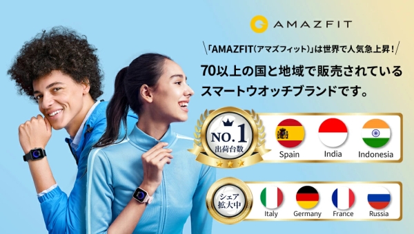 「AMAZFIT(アマズフィット)」は、現在、米国、ドイツ、フランス等、70以上の国と地域で販売されているスマートウォッチをはじめとしたヘルスケアブランドです。