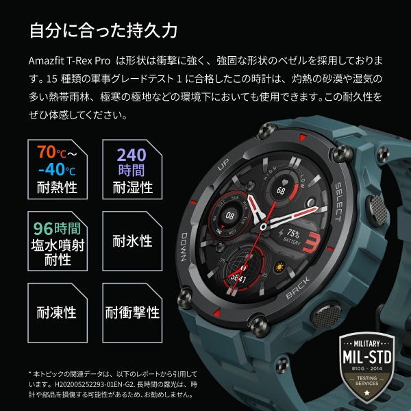 AMAZFITの日本正規代理店である株式会社アースリボーン(東京都千代田区/代表取締役社長 柏原晴馬)は、15種類の軍事グレードテストに合格したこの時計は、灼熱の砂漠や湿気の多い熱帯雨林、極寒の極地などの環境下においても使用できる「Amazfit T-Rex Pro」を、3月23日(火)からネットストアで販売いたします。
