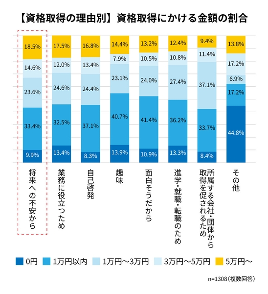 また、資格取得の理由別に資格取得にかける金額を見ると、「資格取得に5万円以上かける」と答えた割合が最も多かったのは「将来への不安」を理由に挙げた回答者でした。この調査結果より、変化の激しい時代における将来への不安が、資格取得への投資に繋がっているとうかがえます。