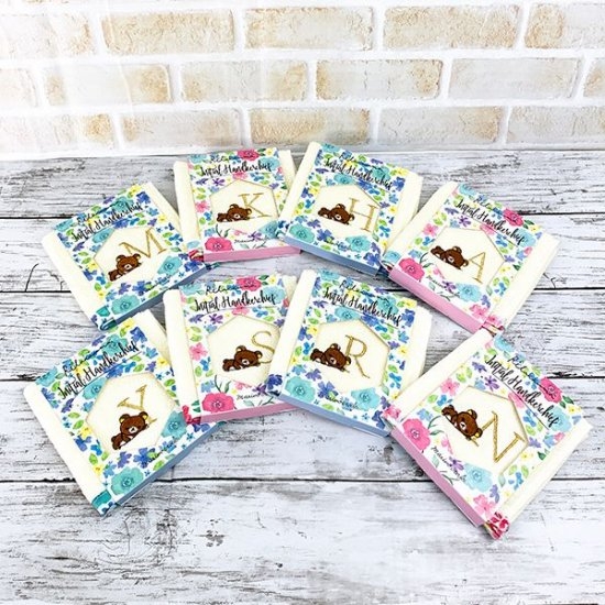 ハンドタオルの縁には花柄がデザインされていて、アルファベットによって色合いが違うのがポイントです♬