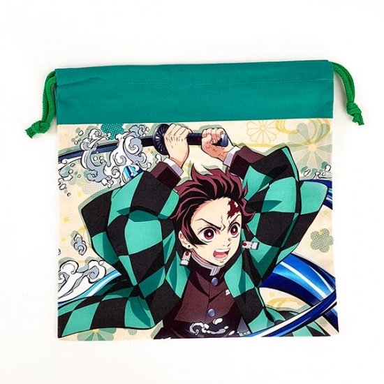 炭治郎のカラーでもある、グリーンを基調としたデザイン。日論刀を手に戦っている姿がデザインされた巾着です。