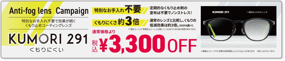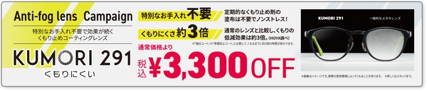 特別なお手入れ不要でノンストレス!通常レンズより約3倍くもりにくいレンズ「KUMORI291」が、通常価格より税込\3,300 OFF!