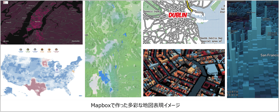 マップボックス社が提供するデジタル地図開発プラットフォーム「Mapbox」は、カスタマイズが容易で、シームレスな表示が可能なベクタータイルセットへ変換されるため、気象情報などのオープン情報や、ユーザーが持つさまざまな情報を重ねて表現できるツールです。カラーリングやフォントも自由にデザインすることができ、地図に載せる情報も3D表示やヒートマップなど多彩な表現ができるため、ナビゲーションアプリだけでなく、防災マップや天気予報、メタバースやゲームなど幅広いコンテンツに活用されています。