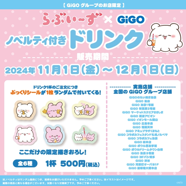 株式会社GENDA GiGO Entertainment(本社:東京都港区 代表取締役社長:二宮 一浩 以下、当社)は、2024年9月14日(土)よりGiGOグループのお店におきまして、人気キャラクター『らぶいーず 』とタイアップした「らぶいーず×GiGO キャンペーン」を開催いたします。