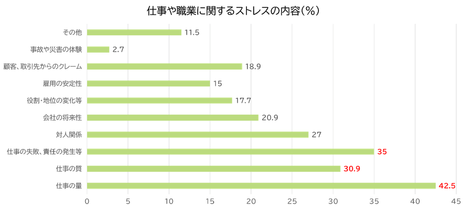 また、ストレスの内容(主な3つを回答)をみると、「仕事の量」が 42.5%と最も多く、「仕事の失敗、責任の発生等」35.0%、「仕事の質」30.9%と続きます。