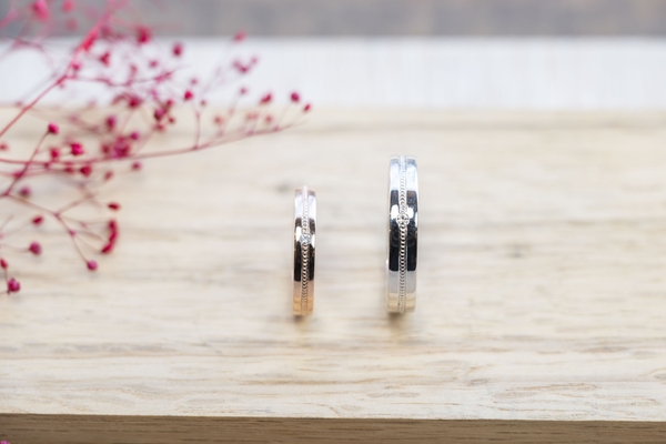 ミルグレイン加工とは、金属の表面に小さな玉を連続して打ち込む装飾技法です。熟練の職人が1つ1つ手作業で打ち込むので温かみを感じられる人気デザインになっております。