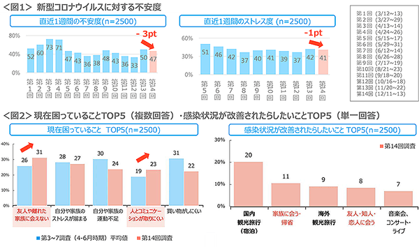 定点指標の「直近1週間の不安度」は、11月より3pの微減。「ストレス度」は、感染者数増加の影響から11月は増加へと転じ、12月も同水準で推移。<図1> 「現在困っていること」は、第1波(4-6月平均)時期と比べ、「友人や離れた家族に会えない」と「人とコミュニケーションが取りにくい」が5p前後上昇。「感染状況改善後に最もしたいこと」は、「国内観光旅行(宿泊)」がトップ、次いで「家族に会う」「海外観光旅行」「友人・知人・恋人に会う」であり、旅と人がらみが上位である。<図2> 調査実施期間は “勝負の3週間” 最後の週末ではあったが、コロナ疲れや慣れ、気の緩み、度重なる最多感染者数の更新からか、不安度、ストレス度は鈍化している。