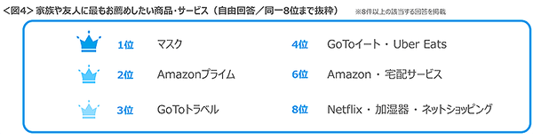 コロナ禍の今年に購入し、家族や知人にお薦めしたい商品・サービスは、「マスク、Amazonプライム、GoToトラベル」といった対コロナ政策、感染予防用品、宅配サービス、動画配信などが上位となり、概ねコロナ禍に関わる商品・サービスが占める結果となった。<図4>