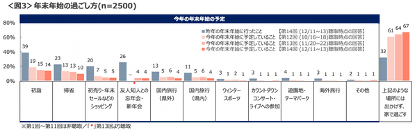 昨年の年末年始に「出かけず家で過ごす(した)」人は32%、今年は、去年の2倍の67%が家で過ごすと答え、軒並み、初詣や帰省など外出を伴う年末年始らしい行動をつつしむ傾向が見てとれる。感染者数が増え始めた10月から「家で過ごす」割合は増加傾向にある。年末年始は、コロナが終息していない現状では、人(たまに会う家族や知人)と会うのをひかえようとしている様子がうかがえる。<図3>