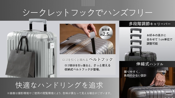暗証番号式のダブルTSAロックで防犯性を強化し、ハンズフリーで使えるシークレットフックを装備。伸縮式キャリーバーや握りやすいハンドル、メッシュポケット付きの内装で、整理整頓も簡単です。さらに、付属のスペアキャスターとレンチにより、長く使える設計も魅力。出張にも観光にも最適な、機能美あふれる設計が日常の旅をより上質に彩ります。