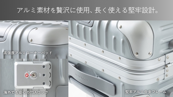 従来のアルミ製スーツケースは「重い」、樹脂製は「強度が不安」といった声が多く寄せられていました。そこでMAIMOは、アルミの剛性とポリカーボネートの軽さを両立させるべく、素材と設計をゼロから再構築。耐衝撃テスト400kgクリアの堅牢構造を実現しました。さらに、静音キャスターやシークレットフックなど細部まで使い心地を追求し、すべての旅人に上質な移動体験を届けます。