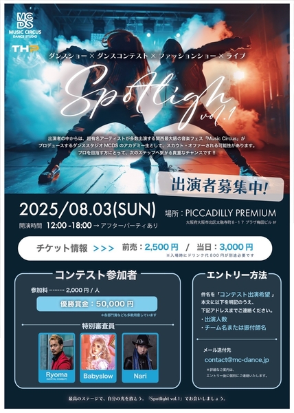 関西屈指の音楽フェス「Music Circus」がプロデュースするダンスコンテスト。全国から集まる実力派ダンサーたちが、熱いステージで頂点を競い合うだけでなく、観客の心を動かす“本気のパフォーマンス”を披露します。さらに、出演者の中から「Music Circus」本公演へのスカウトのチャンスも。
