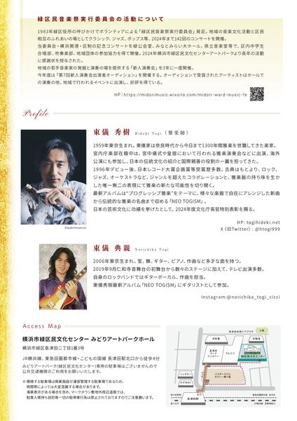 第143回緑区民音楽祭スペシャルコンサート『東儀秀樹ミニトーク&ライブwith東儀典親』~今この時 郷愁を誘い未来を照らす雅楽に 心おどる~が2025年11月30日(日)に横浜市緑区民文化センター みどりアートパーク(神奈川県横浜市緑区長津田2丁目1-3)にて開催されます。