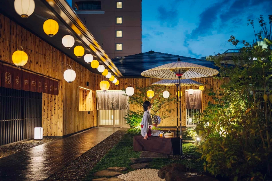 【1】赤い提灯が灯る「湯の広場」に別府温泉ならではの屋台登場