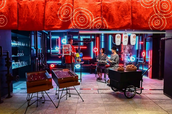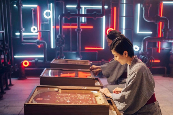【2】温泉街の裏路地をイメージした「ラボ」でスマートボールに興じる