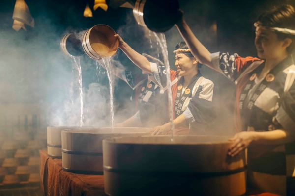 別府湾を一望するロビー「湯の広場」には夜の帳が下りると、夏限定でしつらえた赤い和紙の提灯が引き立ち、別府音頭が流れる夏祭りのメイン会場に。期間限定で別府の観光名所「血の池地獄」や「海地獄」などをイメージした色合いの7種のカクテルが並ぶ「地獄巡りバー」やスパイスを使い、好みの辛さで味わうことができる「地獄ラーメン」を提供する屋台が登場します。また、溶けにくく、そぞろ歩きにぴったりな「葛アイス」を提供します。輪投げや型抜きなどの昔懐かしい遊びから、別府の工芸「竹細工」のクラフト体験もあり、大人も楽しめる空間です。メインの催しであるご当地楽「湯治ジャグバンド」では、法被をまとったスタッフが豊富な温泉と、桶から生み出される音色を使って、会場を盛り上げます。