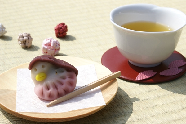 作った和菓子は、「花開く」というおめでたい意味からお祝いの席で飲まれる桜茶と一緒に客室で楽しみます。特別和室限定でしつらえられた、つるし飾りには長寿や開運の意味が込められており、縁起のいい数として割り切れない奇数の人形が連なります。長寿や健康の意味を持つ鶴や、邪気を払うと言われている桃のモチーフの人形を眺めながら、新たな年の開運を願います。