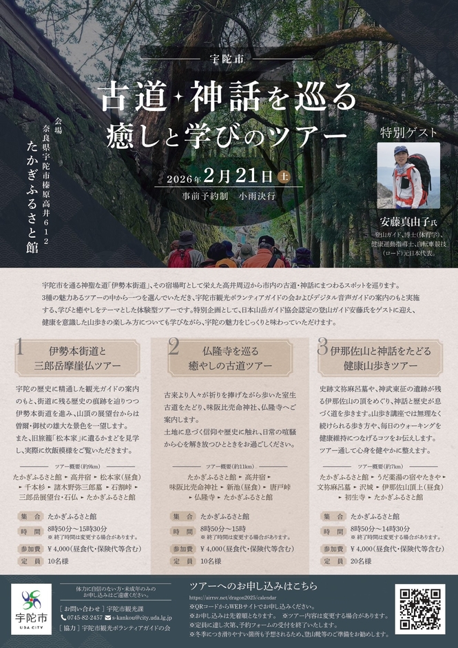 本イベントは、宇陀市内牧地域の「たかぎふるさと館」を起点に、かつておいせ参り参宮者が多く利用した神聖な道「伊勢本街道」、女人高野・室生寺へ至る道「室生古道」、神武東征の神話を遺す「伊那佐山」などを舞台に、地元観光ガイドおよびデジタル音声ガイドの案内のもと実施する、学びと癒やしをテーマとした体験型ツアーです。