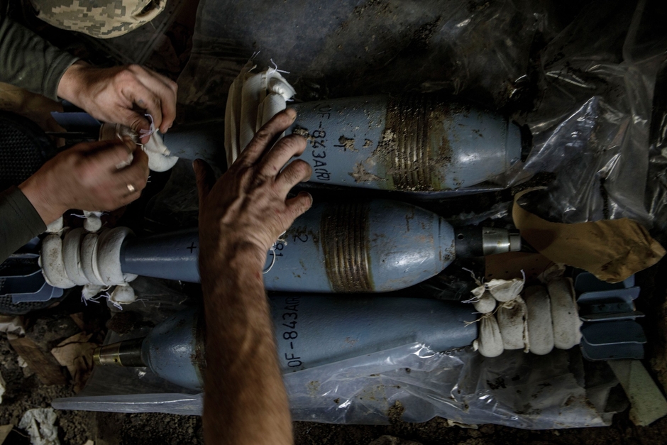 前線の塹壕の中で追撃砲の砲弾の準備をする兵士たち(2022年9月、ポサード・ポクロフスケ)