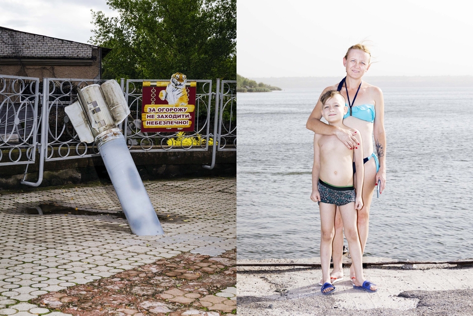 (右)独立記念日に水遊びをする母子。遠くで空襲警報が鳴っていた(2022年8月、ミコライウ)