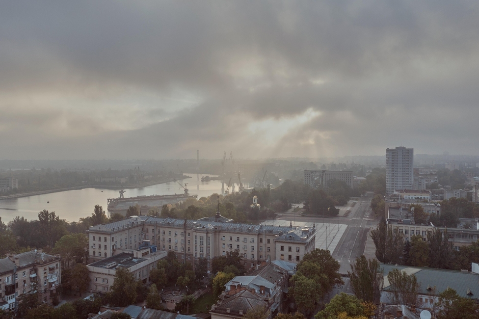 連日ミサイルが飛び、街の中心広場は立ち入りを制限する検問所が設置されていた(2022年10月、ミコライウ)