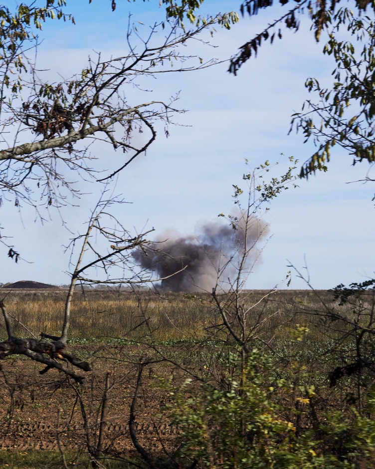 道路沿いの防風林を狙った砲弾が畑に着弾し、土煙を上げる(2022年10月、へルソン北部)