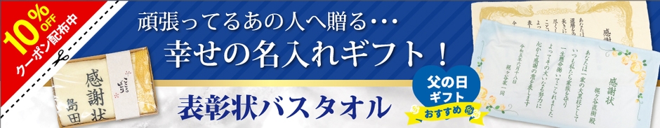 父の日に間に合うように、6月6日から先着100注文に、感謝状バスタオルを通常価格より10%オフになるクーポンを配布いたします。この機会に、父の日の贈り物としてもぴったりな感謝状バスタオルをお求めください。